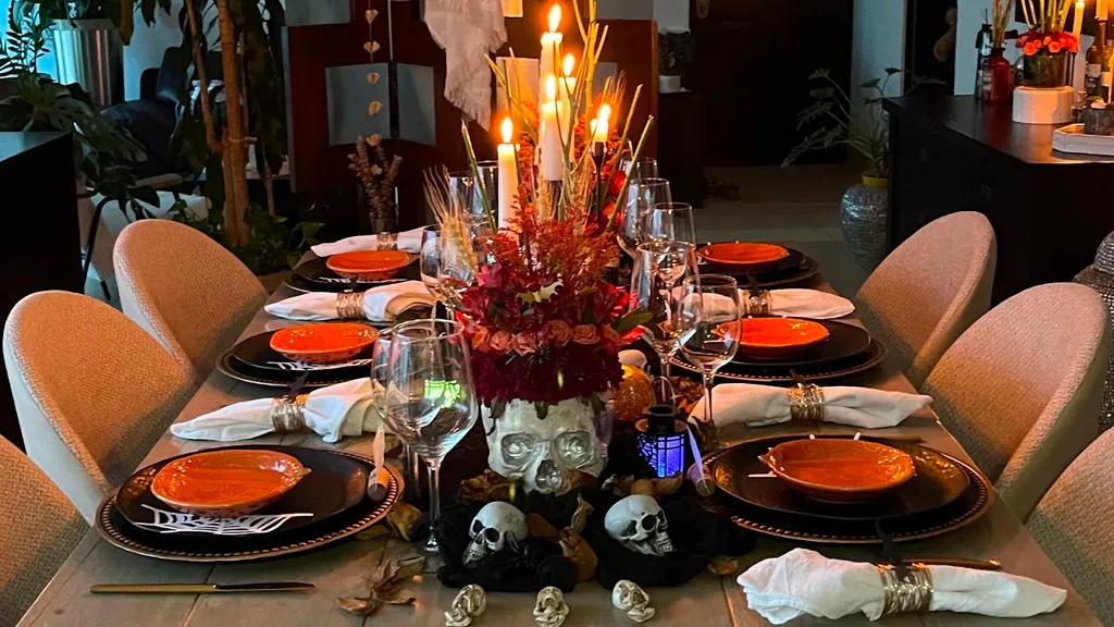 Ngoài việc trang trí không gian chung, bàn ăn cũng cần được trang trí theo chủ đề Halloween. Bạn có thể sử dụng các mẫu khăn trải bàn màu đen, cam với họa tiết ma quái. Kết hợp với chén dĩa, ly tách có hình ảnh Halloween để tạo điểm nhấn.