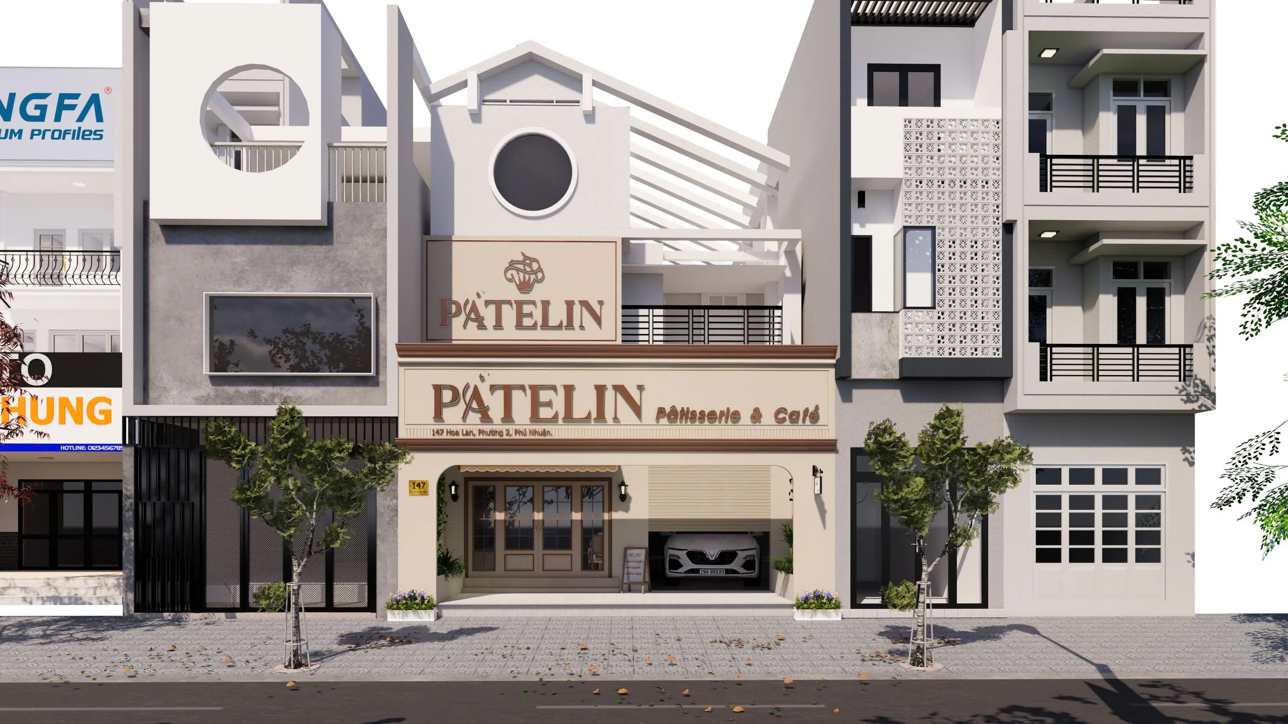 Mặt tiền của tiệm gây ấn tượng mạnh với thiết kế tối giản nhưng đầy cuốn hút, kết hợp các hình khối hiện đại và tông màu be chủ đạo. Logo Patelin được đặt ở cổng tiệm và tầng 2 để tăng độ nhận diện thương hiệu nhưng vẫn đảm sự hài hòa trong bố cục.