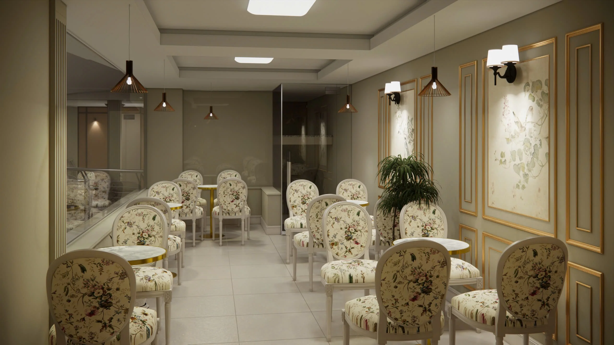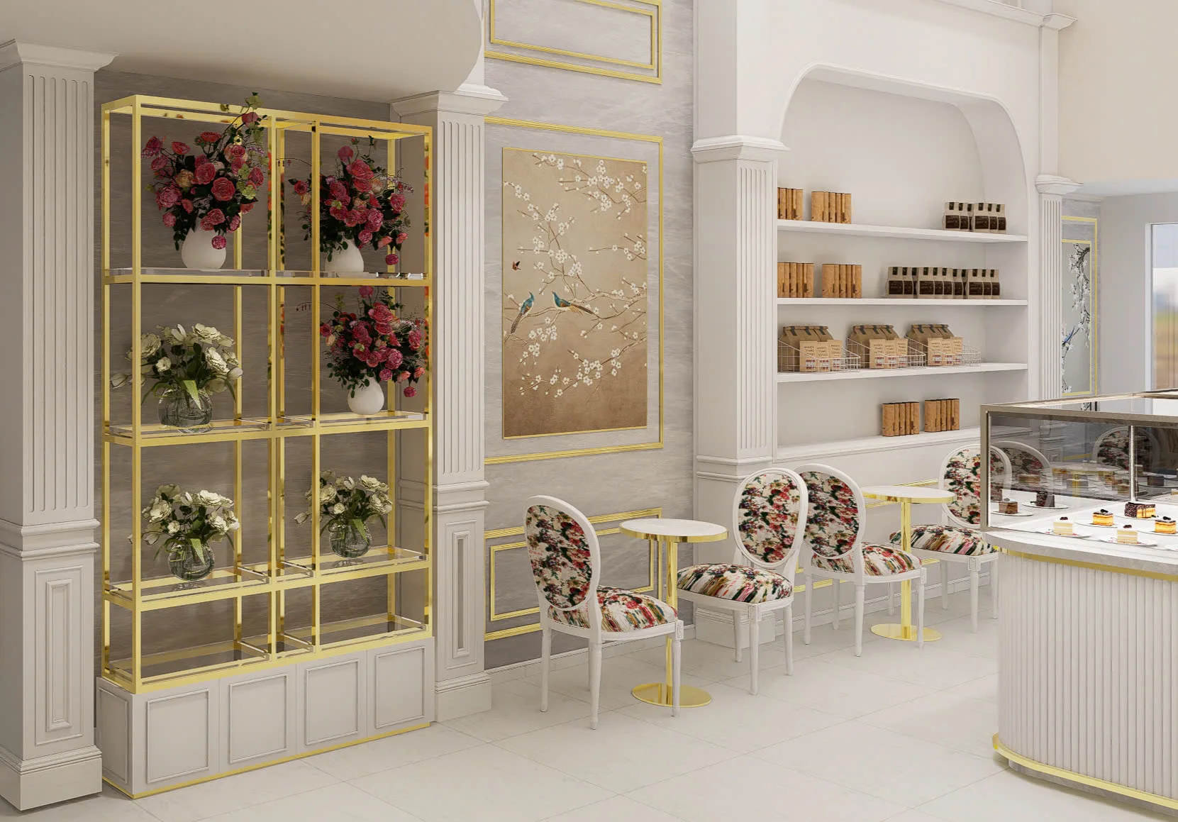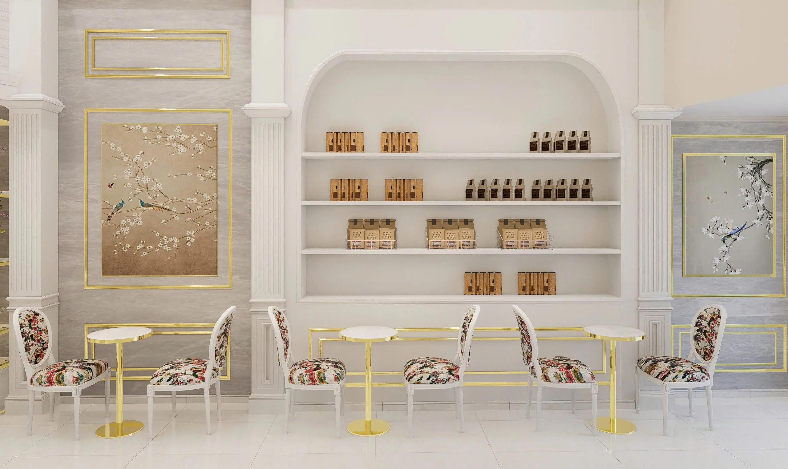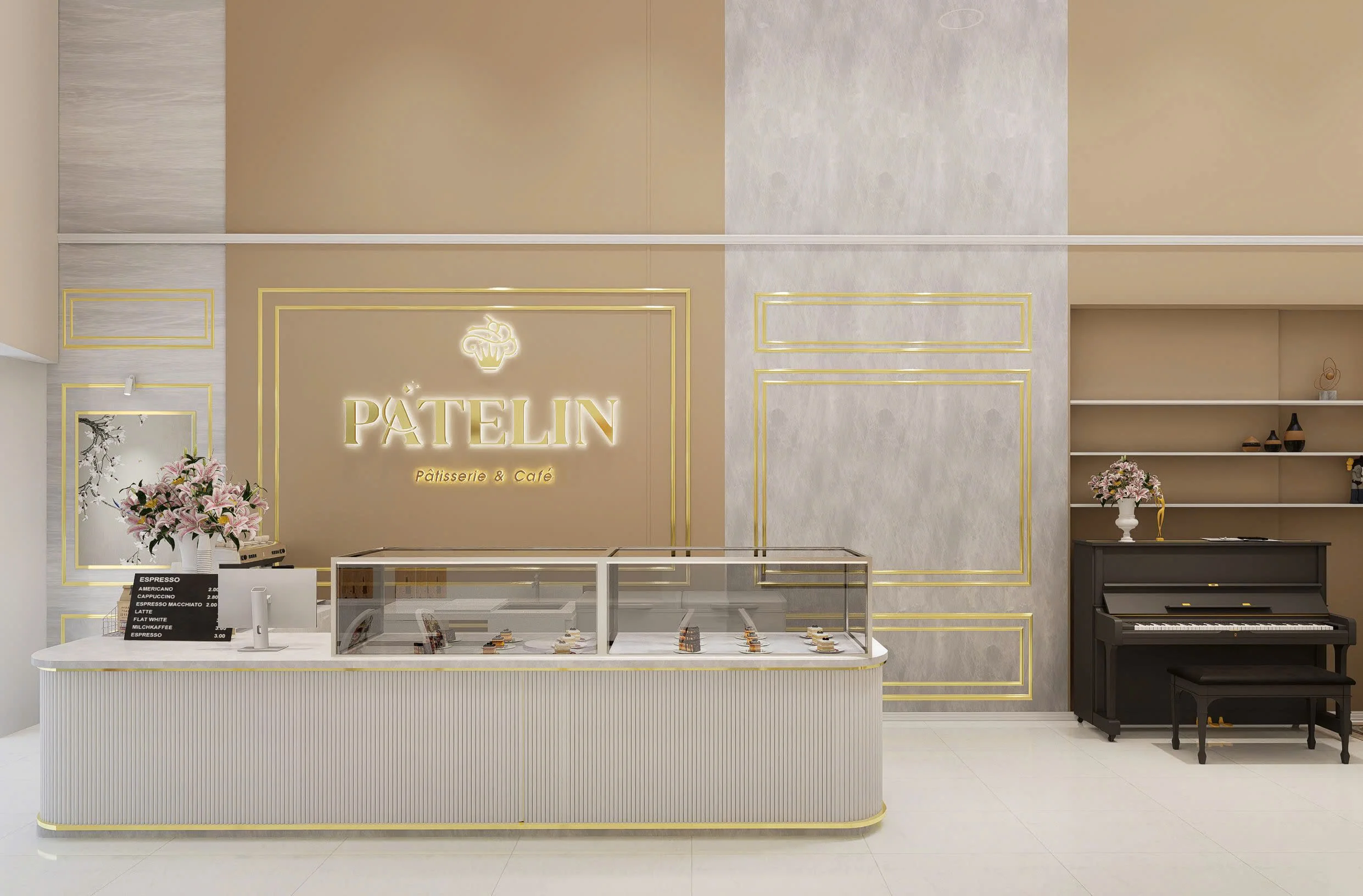 Tổng thể concept của dự án thiết kế tiệm bánh ngọt & cà phê Patelin mang đậm nét tinh tế và hiện đại. Với nội thất tone màu trung tính, vát cạnh bằng những đường mạ vàng sang trọng. Bộ hoa văn cây, hoa là nét riêng của thương hiệu, mang đến hiệu ứng thị giác độc đáo, thu hút nhưng không quá phô trương. Hãy liên hệ ngay AIC JSC nếu bạn yêu thích phong cách thiết kế tiệm cà phê bánh theo hướng sang trọng và hiện đại này nhé!