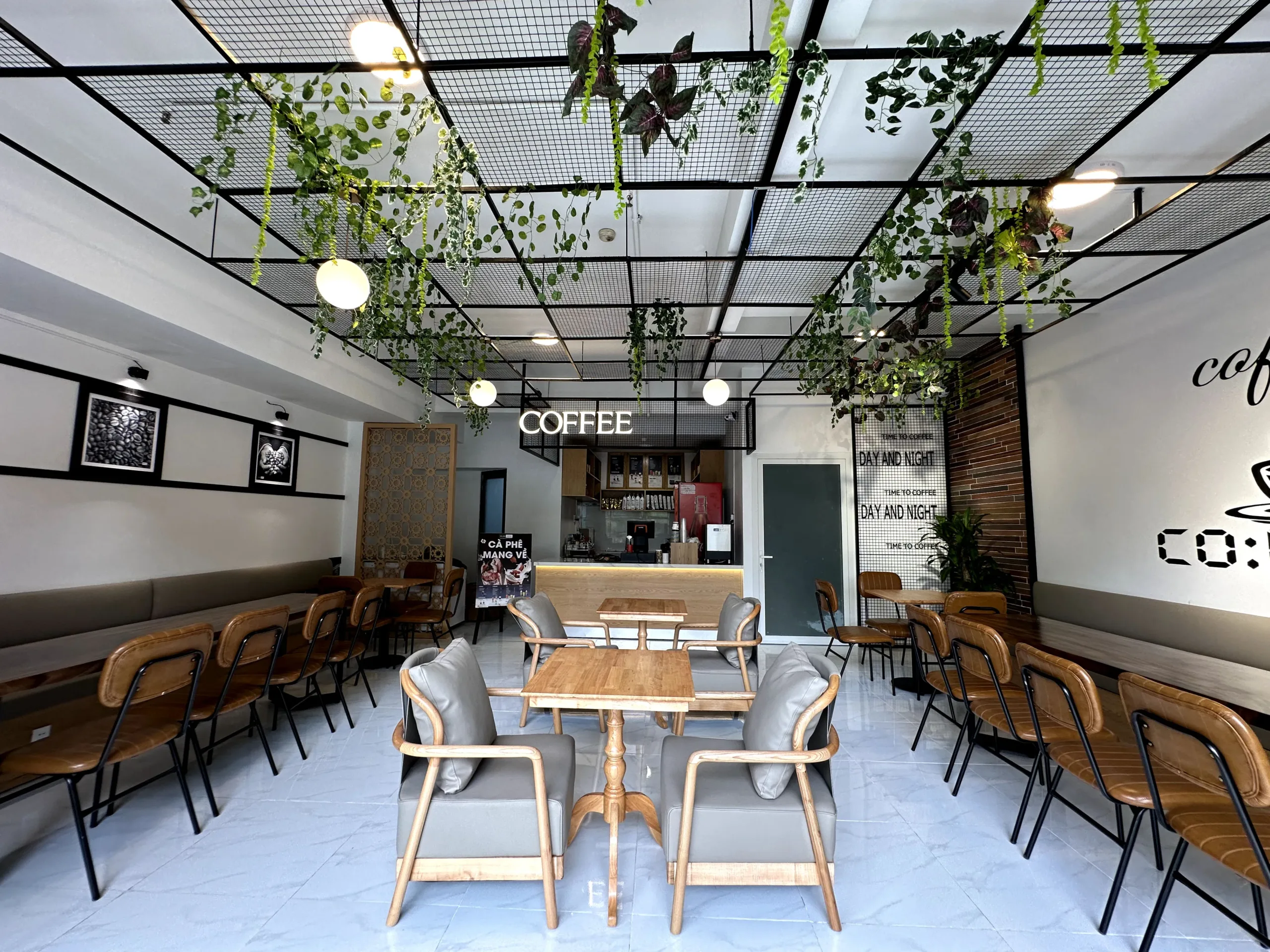Di chuyển lên tầng, ánh sáng sẽ được giảm dịu tạo sự ấm cúng cho thực khách. Nội thất không gian tầng 2 được bố trí tương đồng tầng trệt, bổ trợ thêm hệ đèn thả trần với ánh sáng vàng nhẹ. Bàn ghế được sắp xếp gọn gàng, cạnh tường để tạo sự thông thoáng cho không gian.