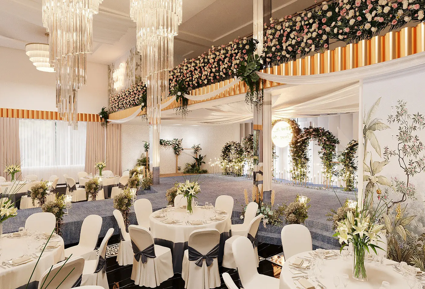 Khi thiết kế nhà hàng, không gian cần phải đủ rộng rãi. Để chứa đựng số lượng khách mời dự kiến. Đồng thời, sự linh hoạt trong cách bố trí không gian là điều cần thiết để phù hợp với nhiều loại hình tổ chức tiệc khác nhau, từ các tiệc truyền thống đến tiệc ngoài trời, giúp tối ưu hóa trải nghiệm cho mọi người tham dự. Khi bước vào một nhà hàng tiệc cưới được thiết kế tinh tế, khách mời sẽ. Cảm nhận được sự cẩn trọng từng chi tiết xuyên suốt không gian. Từ lựa chọn màu sắc cho đến bố trí ánh sáng và vật liệu trang trí, mỗi yếu tố đều được chăm chút. Kỹ lưỡng để tạo nên một không gian sang trọng, thú vị và lôi cuốn.
