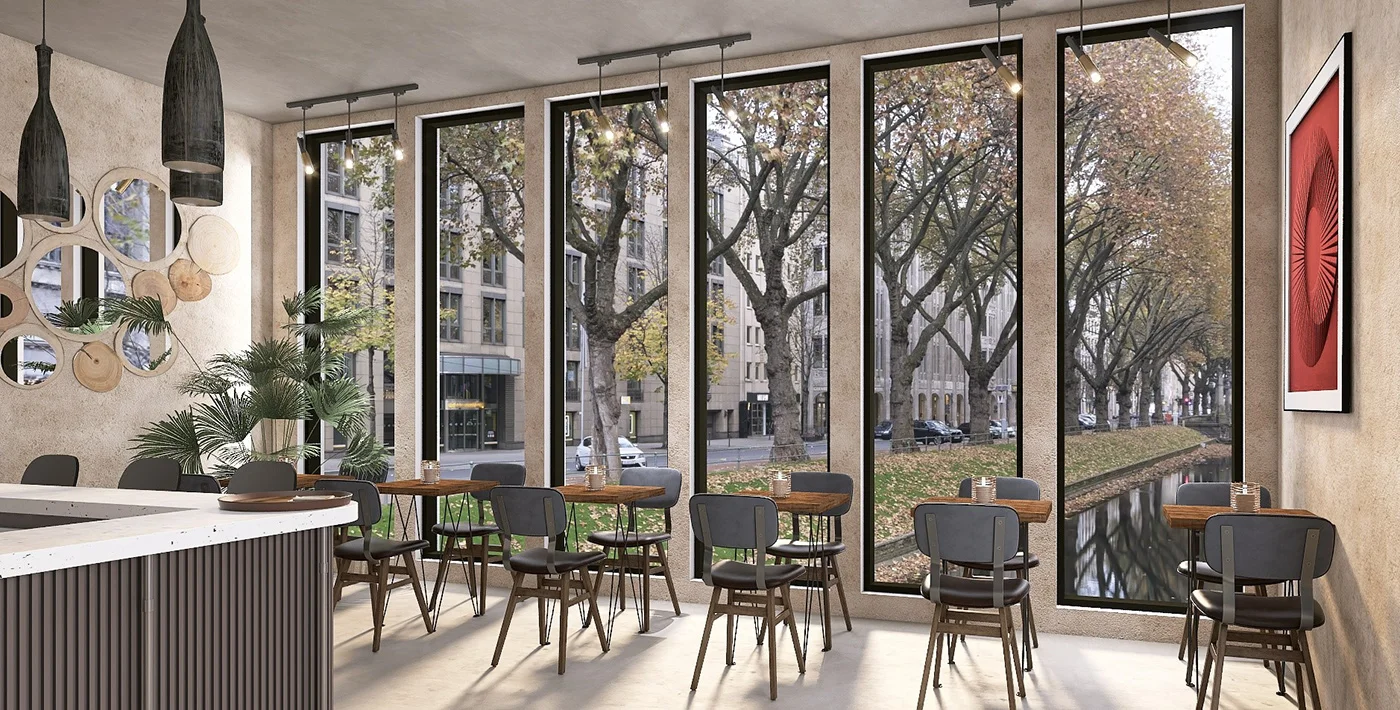 Việc sử dụng các vách kính lớn hoặc cửa sổ rộng có thể mang lại ánh sáng tự nhiên vào trong quán, tạo nên một cảm giác gần gũi với thiên nhiên. Hơn nữa, không gian mở cũng giúp quán cà phê của bạn trở nên thoáng đãng và sạch sẽ hơn. Một số quán còn sử dụng bàn ghế ngoài trời để tối ưu hóa không gian.