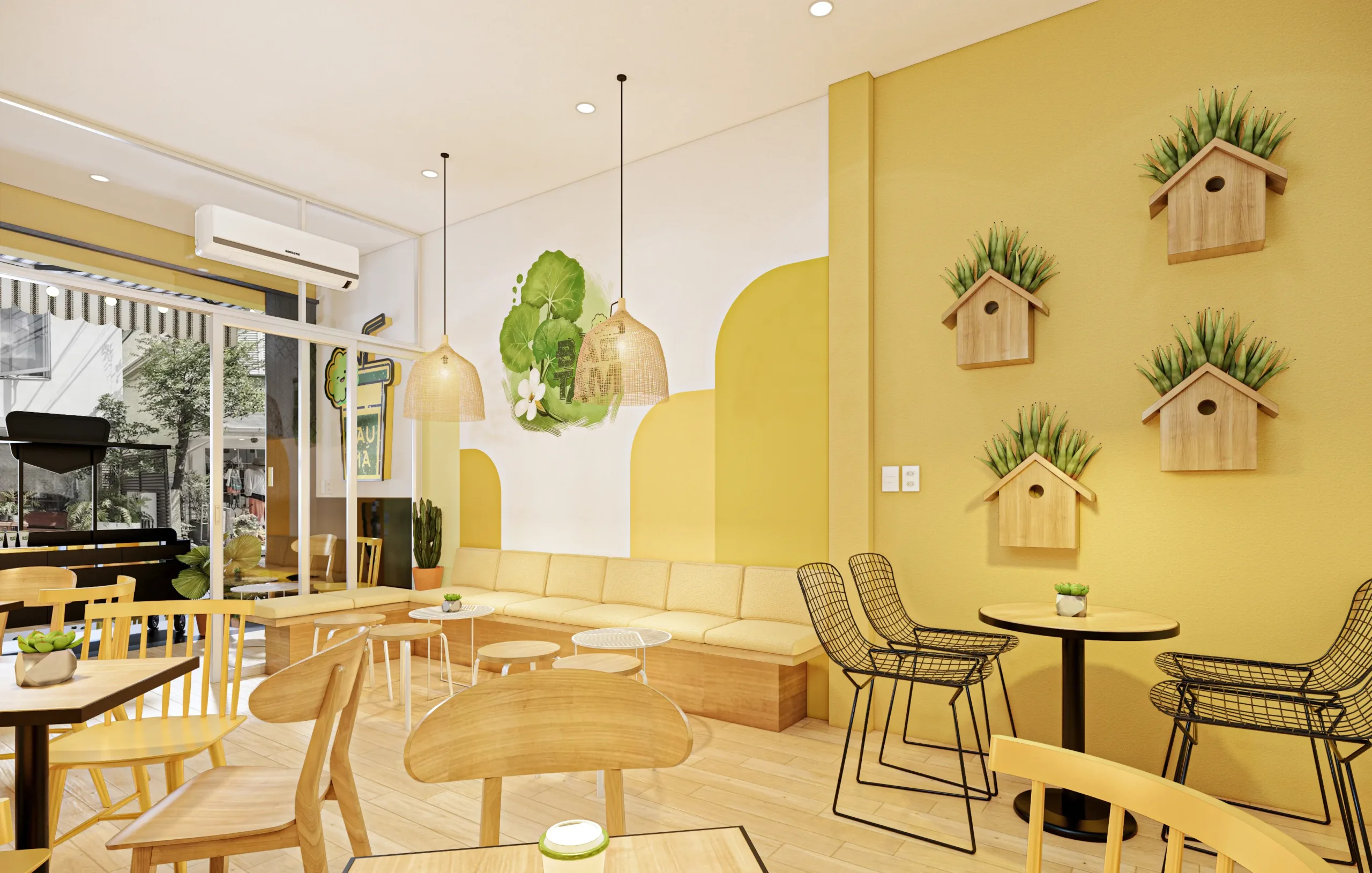 Những gam màu tươi sáng như vàng, xanh lá cây hay cam có khả năng thu hút sự chú ý và tạo cảm giác vui vẻ cho khách hàng. Với không gian nhỏ hẹp, việc sử dụng màu sáng có thể giúp cho quán trở nên rộng rãi hơn. Hãy cân nhắc về việc phối hợp màu sắc giữa nội thất và ngoại thất để tạo nên sự hài hòa.